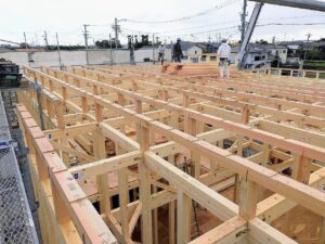 柱が立ち、梁が組まれ、屋根の下地がかかるまでの一連の流れは、