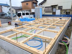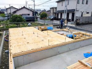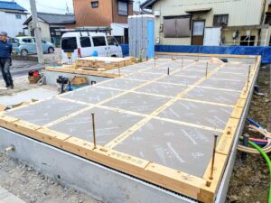 四日市市伊倉にて建築中の建売住宅で、土台伏せ工事を行いました。